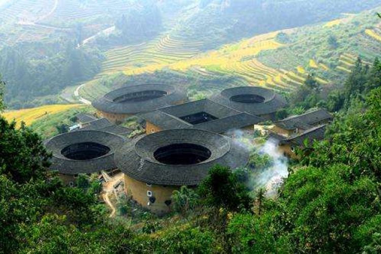 然后乘汽车前往南靖,乘汽车前往南靖参观【福建土楼】主要位于福建省漳州市、龙岩市、泉州市境内,包括南靖土楼、永定土楼、华安土楼、平和土楼、诏安土楼、云霄土楼、漳浦土楼、泉州土楼等土楼群。福建现存的圆楼、方楼、五角楼、八角楼、吊脚楼等各式土楼有30多种23000多座。,【田螺坑】田螺坑村,属福建省漳州市南靖县书洋镇,是一个土楼村落,由1座方形、 3座圆形和1座椭圆形共5座土楼组成,居中的方形步云楼和右上方的圆形和昌楼建于清嘉庆元年(1796年),以后又在周边相继建起振昌楼、瑞云楼、文昌楼。五座土楼依山势错落布局,在群山环抱之中,居高俯瞰,像一朵盛开的梅花点缀在大地上,又像是飞碟从天而降,构成人文造艺与自然环境巧妙天成的绝景,令人叹为观止,是民居建筑百花园中的一朵奇葩。【东倒西歪楼】裕昌楼是现存福建最古老土楼之一,属世界文化遗产福建土楼部分,位于南靖县书洋镇下坂村,离塔下村仅1公里。下坂村目前有369户4000余人,主要的经济来源为茶和柿子。裕昌楼建于元末明初(约1308-1338年),为刘、罗、张、唐、范五姓族人共同建造,因此故把整座楼分为间数不等的五大卦,每卦设一部楼梯,每个家族各居一卦。楼为5层结构,每层有54间大小相同的斧状房间,底层为厨房,家家厨房有一口深1米、宽0.5米的水井,井水清净甘甜,拿起瓢子伸手即可打水。楼内天井中心建有单层圆形祖堂,祖堂前面天井用卵石铺成大圆圈,等分五格,代表”金、木、水、火、土”五行。这座土楼建成后不久,楼内回廊木柱便开始从左向右倾斜,最大倾斜度为15度,看起来摇摇欲坠,但经受几百年风雨侵蚀和无数次地震的考验,至今依然如故,有惊无险,所以裕昌楼又称”东倒西歪楼”。【塔下村】塔下村是典型的客家聚居地,构筑于“两山夹水、铁扇关门”山川形胜中的太极状村落格局保存完整,是客家血缘伦理关系和聚族而居传统文化的见证,也是研究福建土楼历史演变和大型夯土民居建筑建造技术的重要实例。村中国家级文物保护单位德远堂、石龙旗等历史遗存和“春祭”“作大福”等传统习俗,展现客家文化对中原文化的固守与承袭,为研究中原文化改变和汉族南迁史提供了佐证素材。塔下村土楼沿河而建,土楼形态丰富,有常见的方形、圆形土楼,还有围裙形、曲尺形土楼,最独特的是还有浙杭水乡模式单院式土木、砖木结构的吊角楼,形成大楼带小楼、高低错落布局的景观,其中,裕德楼和顺昌楼位于溪流两侧,结合溪流形似太极,塔下村因此被誉为“太极水乡”。塔下村有客家木偶戏、客家土楼营造技艺等非物质文化遗产。下午参观【云水谣古镇】云水谣,“南靖云水谣”原名长教,位于漳州市南靖县境内,属于世界文化遗产“福建土楼”的一个景区,国家5A级。那里山川秀美、人文丰富。村中幽长古道、百年老榕、神奇土楼,还有那灵山碧水,无不给人以超然的感觉。 2005年底,由张克辉以自己和几位台胞的生活阅历为原型创作的电影文学剧本《寻找》改编的电影《云水谣》,曾经在此拍摄取景。